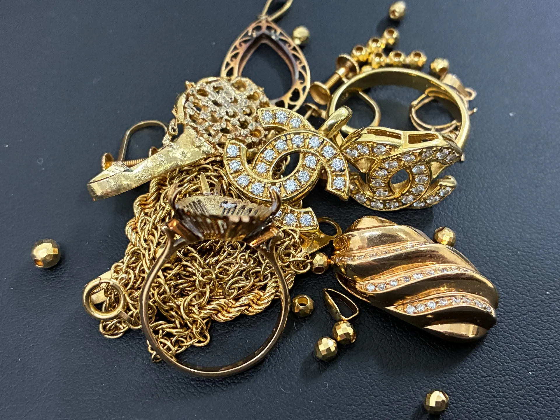 お写真の中には、小さなダイヤモンド(メレダイヤ)が贅沢にあしらわれたジュエリーもございました。一般的な買取店では「石の重さを引いた地金代だけ」になることも多いですが、当店では**「デザイン性」と「石の価値」**をしっかりプラスして評価いたします。